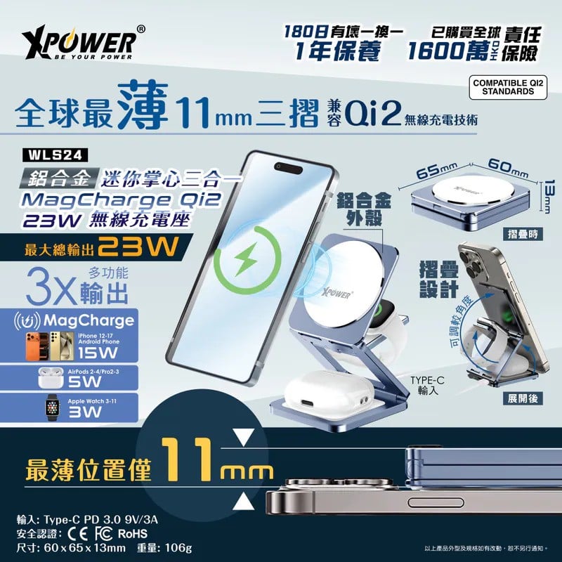 XPower WLS24 全球最薄鋁合金 3合1 Qi2 折疊式磁吸無線充電座
