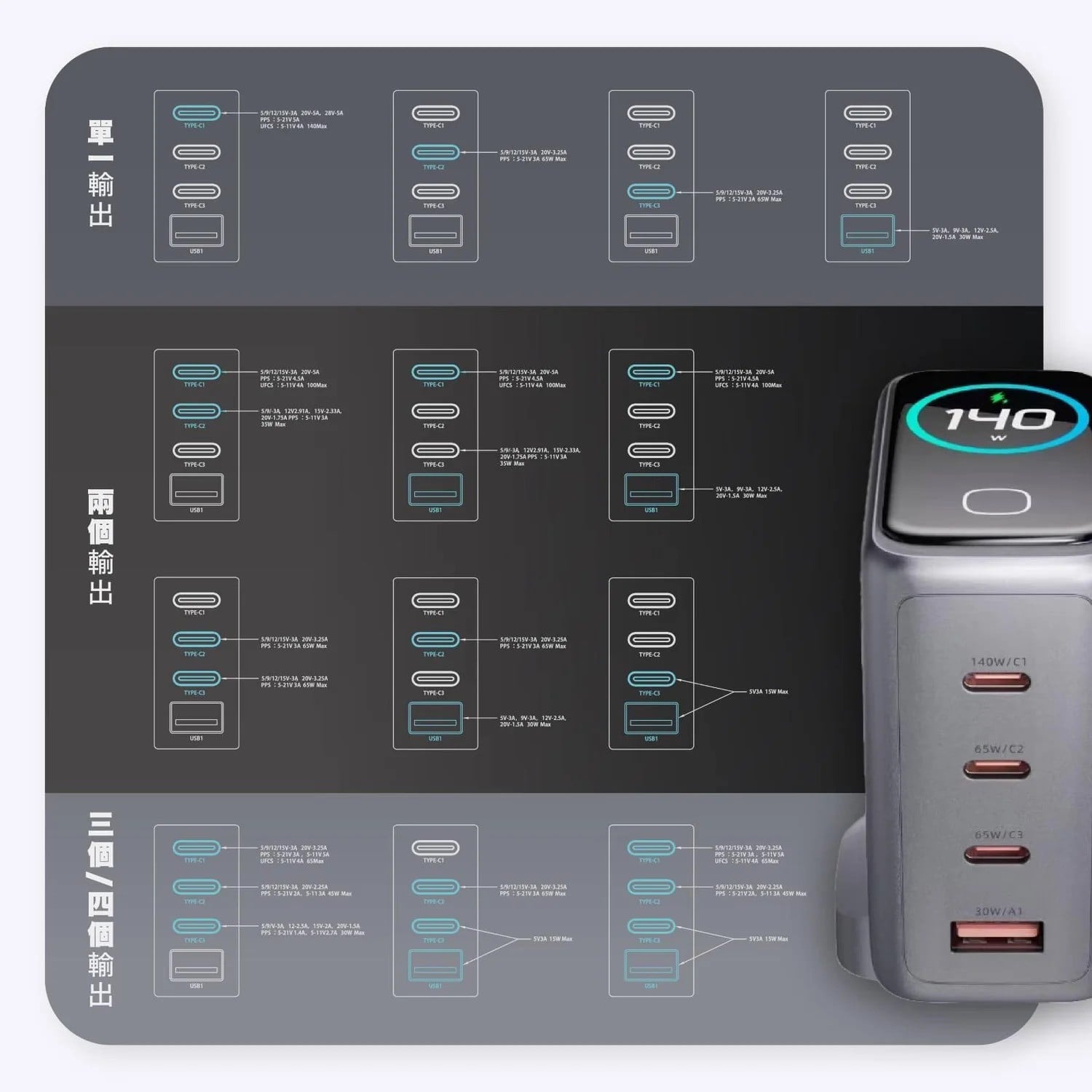 3C1A 四端口同時快充: 具備 3 組 USB‑C 及 1 組 USB‑A,總功率 140W 範圍內智慧分配,滿足多裝置同時充電: