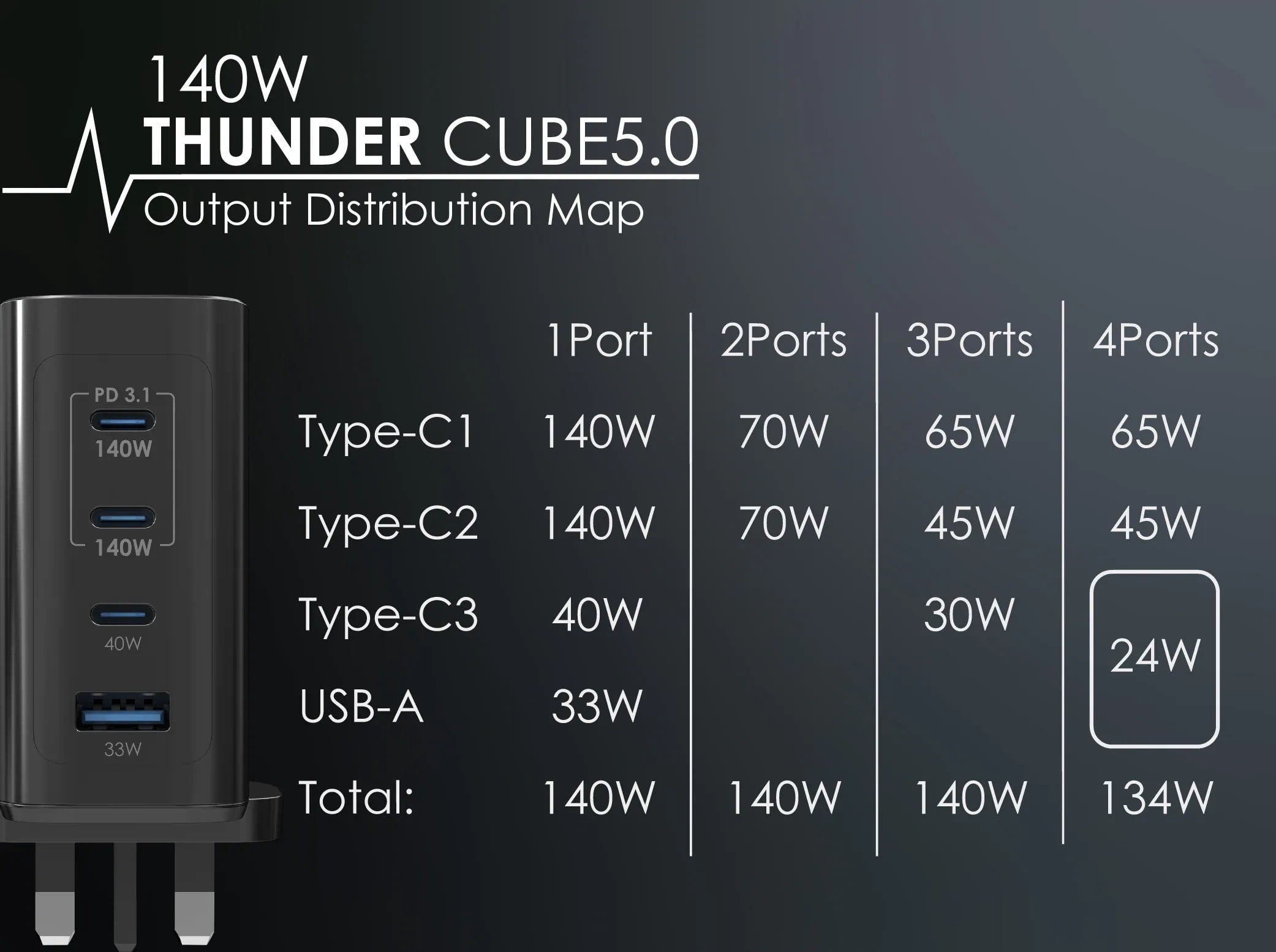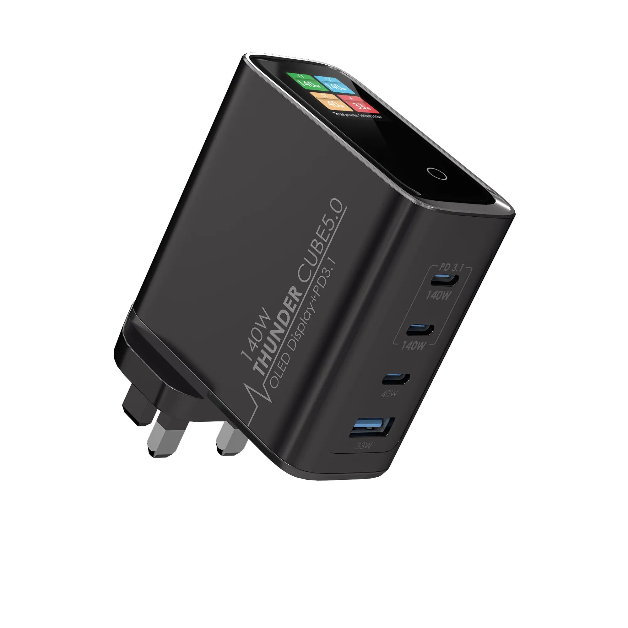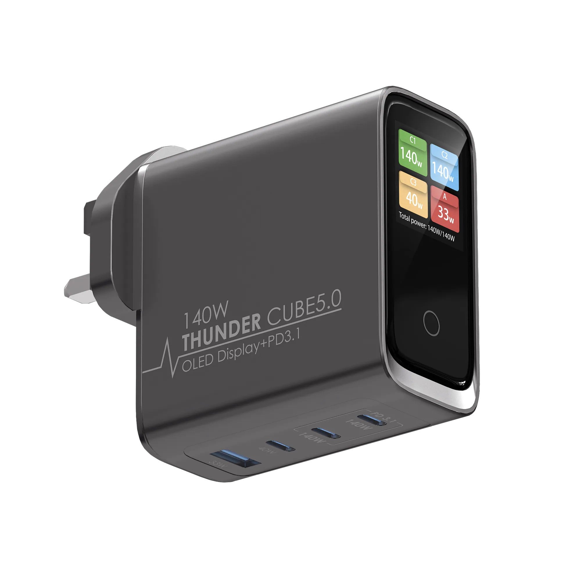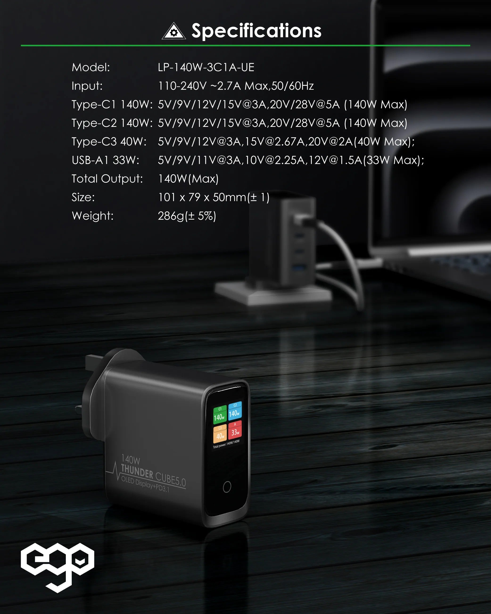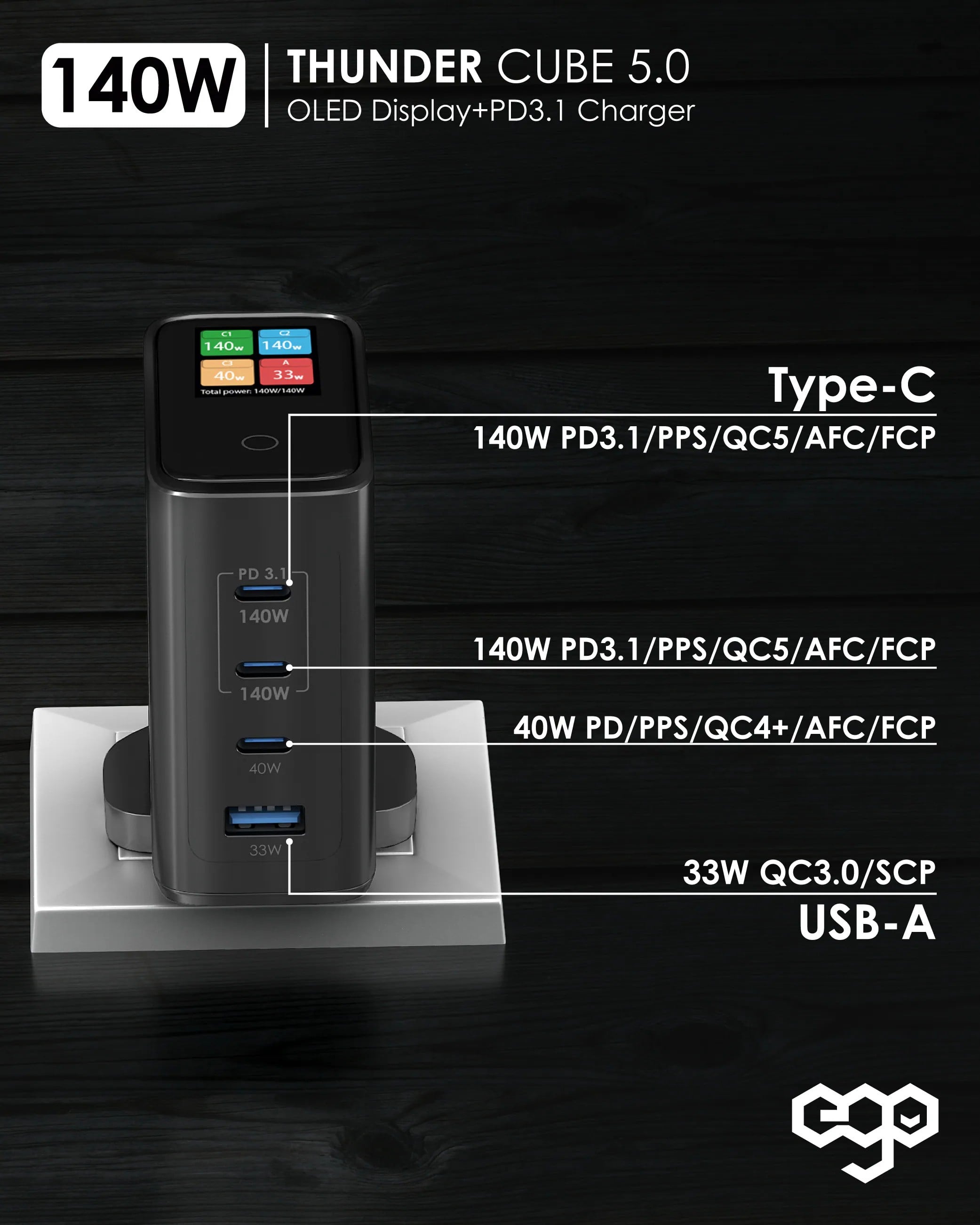 EGO 140W THUNDER CUBE 5 OLED 充電器 0. 支援PD3.1 140W, 支援Macbook pro 140W 1. 支援PPS 5A, 支援 三星 超級快充2.0 2. 新增 OLED 屏膜 ,實時輸出速度,AI溫控 3. GaN3代晶片, 超低發熱量 4. 4USB輸出, 實現同時3USB快充 5. 8重安全保護 6. IEC62368安全認證, BS1363安全認證