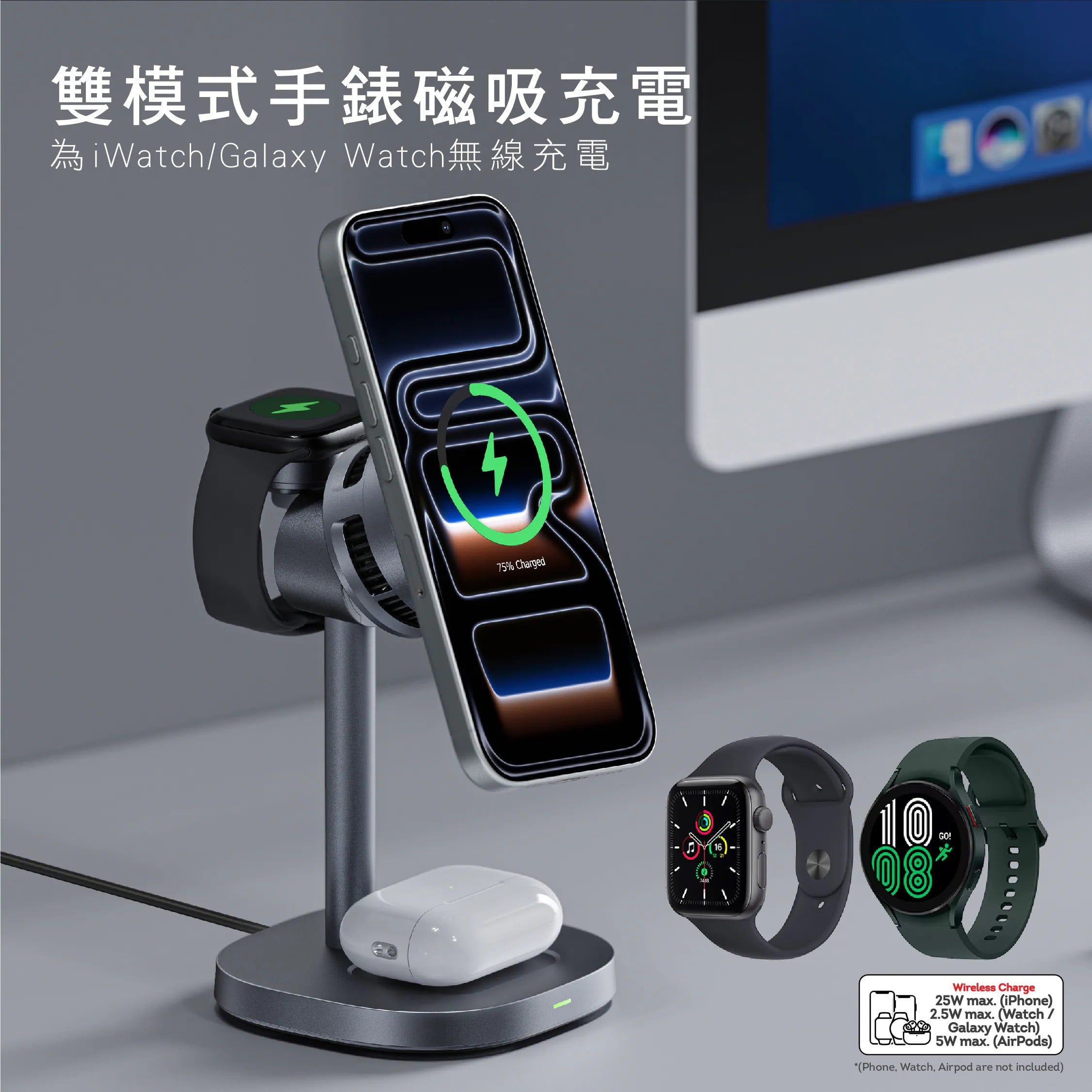 - 主動製冷技術,鋁合金散熱風扇,快速冷卻 - Qi2.2認證 - 為iPhone 17/16系列提供25W無線快充 - Galaxy-Z Fold, Z Flip/S25系列Qi2無線充- 雙模式iWatch/Galaxy Watch磁吸充電 - AirPods/Earbuds 5W無線充 - 鋁合金支架,手機角度可調節 - 已配備PD45W火牛,最佳效能即體驗 產品特點: - 32.5W Qi2.2 認證•TEC半導體製冷三合一無線充電座連火牛 - Qi2.2官方認證-25W無線充電功率,為您的iPhone 17/16系列快速安全充電 - 兼容大部分支援Qi2/Qi無線充電的Android手機(Galaxy-Z Fold, Z Flip/S25系列)(建議使用磁吸殼以達致最佳無線充電效能) - TEC Semiconductor(半導體製冷)主動散熱技術,採用鋁合金散熱風扇,確保快速冷卻,在低溫下實現更快的充電速度 - 雙模式iWatch/Galaxy Watch磁吸充電座 - 5W耳機無線充底座,適用於支持無線充電的AirPods/Earbuds -可同時為 iPhone/Galaxy Z Fold/Z Flip/S、iWatch/Galaxy Watch、AirPods/Earbuds 進行無線充電 - 鋁合金支架,手機角度可調節,方便的充電體驗 - 產品已配備PD45W USB-C充電器,即時體驗最佳效能 - 通過國際安全規格認證,符合香港安全規格 - 產品保養期為一年並享有全球產品責任保險保障 產品規格:ProMini MagW5 輸入USB-C : DC15V⎓3A, 20V⎓2.25-3.25A 無線充電輸出手機 : 5W/7.5W/10W/15W/25W Max. 手錶 : 2.5W Max. 耳機 : 5W Max. 總輸出 : 最大25W+2.5W+5W. 尺寸 : 100 x 100 x 152毫米 重量 : 338克 電源轉換器輸入 : AC100V-240V~ 50/60Hz 1.2A max. USB-C輸出 : DC5.0V⎓3.0A, 9.0V⎓3.0A, 12.0V⎓3.0A, 15.0V⎓3.0A, 20V⎓2.25A PPS : DC3.3V-11.0V⎓3.0A 總輸出 : 最大45W 兼容:( Qi2.2/Qi2/Qi-enabled smartphones/devices) - iPhone 17/16/15/14/13/12 系列 - *Galaxy-Z Fold, Z Flip/S25系列 - Watch, Watch Ultra, Galaxy Watch - AirPod Pro, AirPod, Earbuds 配備無線充電盒*(建議使用磁吸殼以達致最佳無線充電效能) 包裝內含 - ProMini MagW5 - 45W電源轉換器 - USB-C to C快速充電傳輸線 (約1米) - 用戶說明書
