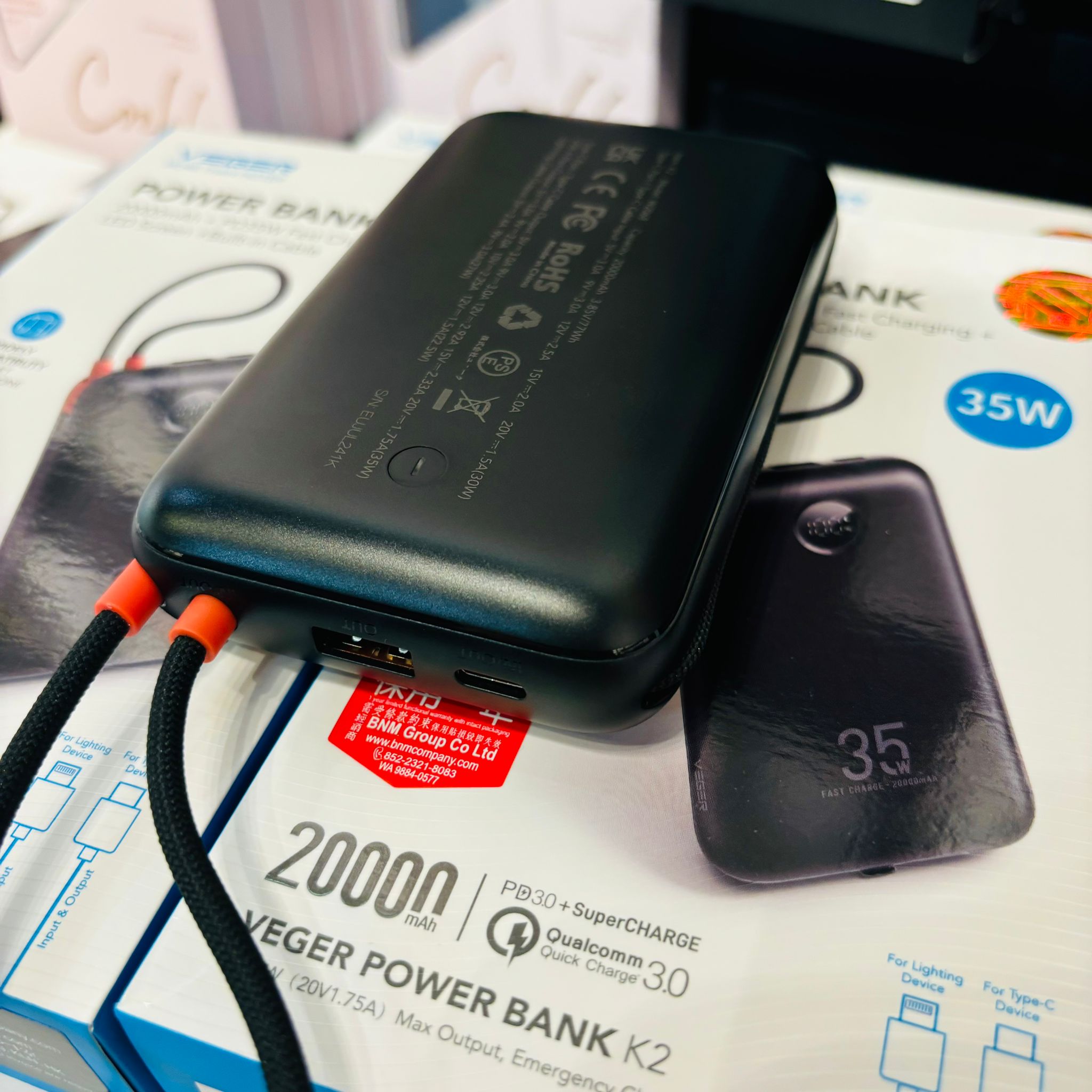 VEGER K2 20000mAh 超薄 LED 顯示自帶線移動電源 產品規格: 輸入: 5V-3.0A / 9V-2.5A / 12V-1.8A / 15V-1.5A(USB-C端口/電纜支持PD22.5W) 輸出: 50-3.0A / 9V-3.0A / 12V-2.92A / 15V-2.33A / 20V-1.75A (USB-C電纜/端口最大35W) 5V-3.0A / 9V-2.0A / 10V-2.25A / 12V-1.5A(USB-A端口最大22.5W) 5V-2.4A / 9V-3.0A(Lightning電纜最大27W) 電池容量: 20000mAh(3.7V),37Wh