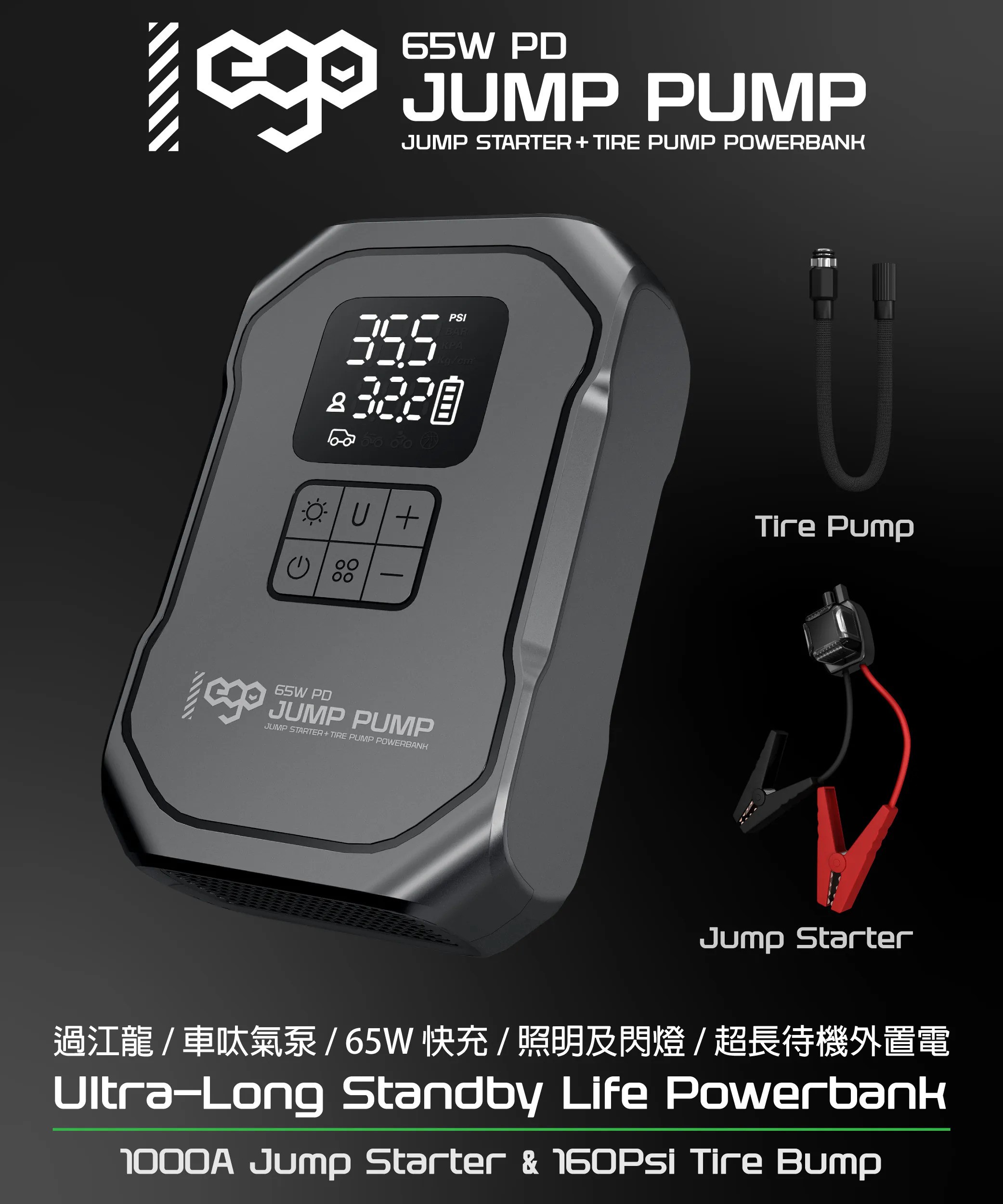 JUMP PUMP 4in1 救車外置電 過江龍 / 車呔氣泵 / 65W 快充 / 照明及閃燈 / 超長待機外置電 養袋千日,用在一時, 想用時發現走晒電? 香港地面經常插釘,想打氣撐一小段路去補呔? 試過架車冇電, 搵架的士搭電又收你600蚊? 充返舊過江龍尿袋又慢又要幾個鐘,放車上充左幾程都未充滿? 架車有事停路邊, 想搵閃燈提醒往來司機注意? 0. 超長待機, 充滿放置一年仲有70%電量 ! 1. 超快速打氣泵1分鐘28L , 超強氣壓160Psi 2. 過江龍支援1000A, 自動檢測著車,足夠為6000cc汽油及3000cc柴油引擎啟動 3. 65W PD 快充輸入 及輸出! 4. LED 顯示電量,調整氣壓, 多達4種氣壓制式(PSI,BAR,KPA, KG/CM3) 5. 照明燈光3種模式(恆亮,閃燈,SOS) 6. 附送車呔接口, 單車咀, 藍球咀 **測試數據由EGO實驗室提供, 結果會因室溫,設備,各環境因素影響, 只供參考。 Model: JP-8 Total Cell Capacity: 8000mAh Battery Capacity: 29.6Wh, 2000mAh, 14.8V Rated Capacity: 5V/1A ,4700mAh Type-C In&Output: 5V/9V/12V/15V/20V@3.25A (65W) USB-A Output: 4.5V/5V/9V/12V@1.5A (22.5W) Total USB Output: 65W Air Pump: 28L/1min Jump Starter 500A~1000A Size: 106mm x 170mm x 49mm(±0.5) Weight: 755g(±10) Contains: Jump Pump, 30cm Tire Pump,Jump Starter, air adapterx2, Type-C cable, Storage Pouch